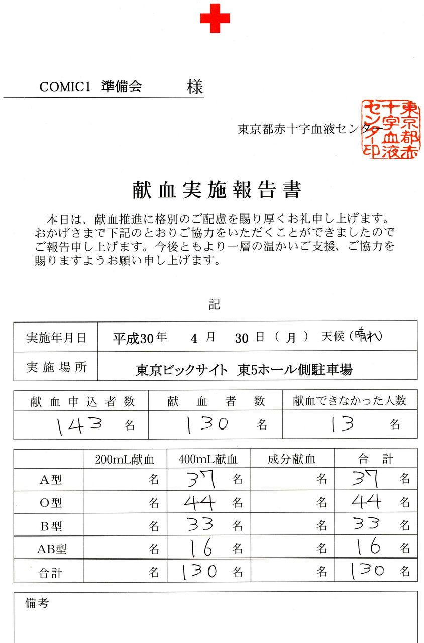 2018年05月05日 ☆13 ご来場ありがとうございました 事務13号です。4月30日に開催されましたCOMIC1☆13は大勢の方にご来場をいただき、感謝をいたします。当日は天候も良く、昨年以上の参加人数でした。会場側の要請により東棟屋外駐車場を待機場所として使う事になり、不慣れな点もあったと思います。次回以降の対応を考えます。東京都赤十字血液センターさんによる献血には大勢の方に協力をいただき、ありがとうございました。色紙プレゼント抽選・発送は今月中旬~下旬を予定していますので、今暫くお待ち願います。10月14日開催のCOMIC1☆14も、宜しくお願いをいたします。